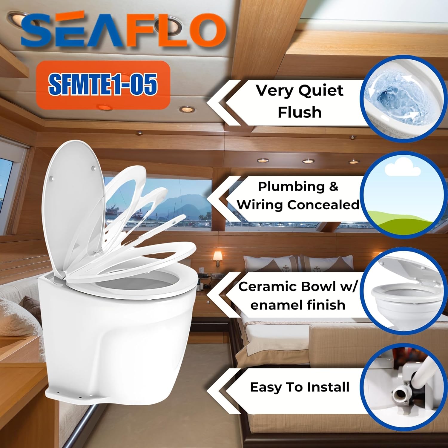 | Included Components | 3-way control panel for flush, fill, and drain functions, Integrated macerator pump system for waste grinding and discharge, Pre-installed internal plumbing components, SEAFLO Deluxe Flush Electric Marine Toilet Unit, Solenoid valve with anti-siphon breaker |