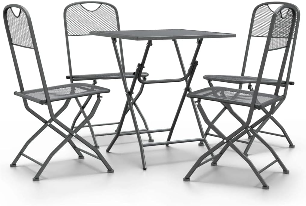 Sit down and enjoy your lovely outdoor dinner or any meal with this garden dining set. Premium material: Expanded metal is a type of sheet metal that has been cut and stretched to form a regular pattern of a metal mesh like material. It is stronger than an equivalent weight of wire mesh. E coating finish: The e coating finish makes the metal weather resistant and corrosion resistant. Therefore, the patio dining set is ever long lasting for outdoor use. Foldable design: Thanks to the foldable design, the patio chairs and table can be folded to save space when not in use. Note: In order to extend the life of your outdoor furniture, we recommend you to clean it regularly and do not leave it outdoors without protection unnecessarily. Clean: Use a mild soap solution. Storing: If possible, store in a cool, dry place indoors. If the product is stored outdoors, protect it with a waterproof cover. Wipe and dry the excess water or snow from flat surfaces after a rain or snowfall. Allow sufficient air circulation to avoid moisture related damage. Colour: Anthracite Material: Expanded metal mesh with e coating finish Table dimensions: 60 x 60 x 72 cm (L x W x H) Chair dimensions: 54 x 40 x 86 cm (L x W x H) Assembly required: Yes Delivery contains: 1 x Table 4 x Chair