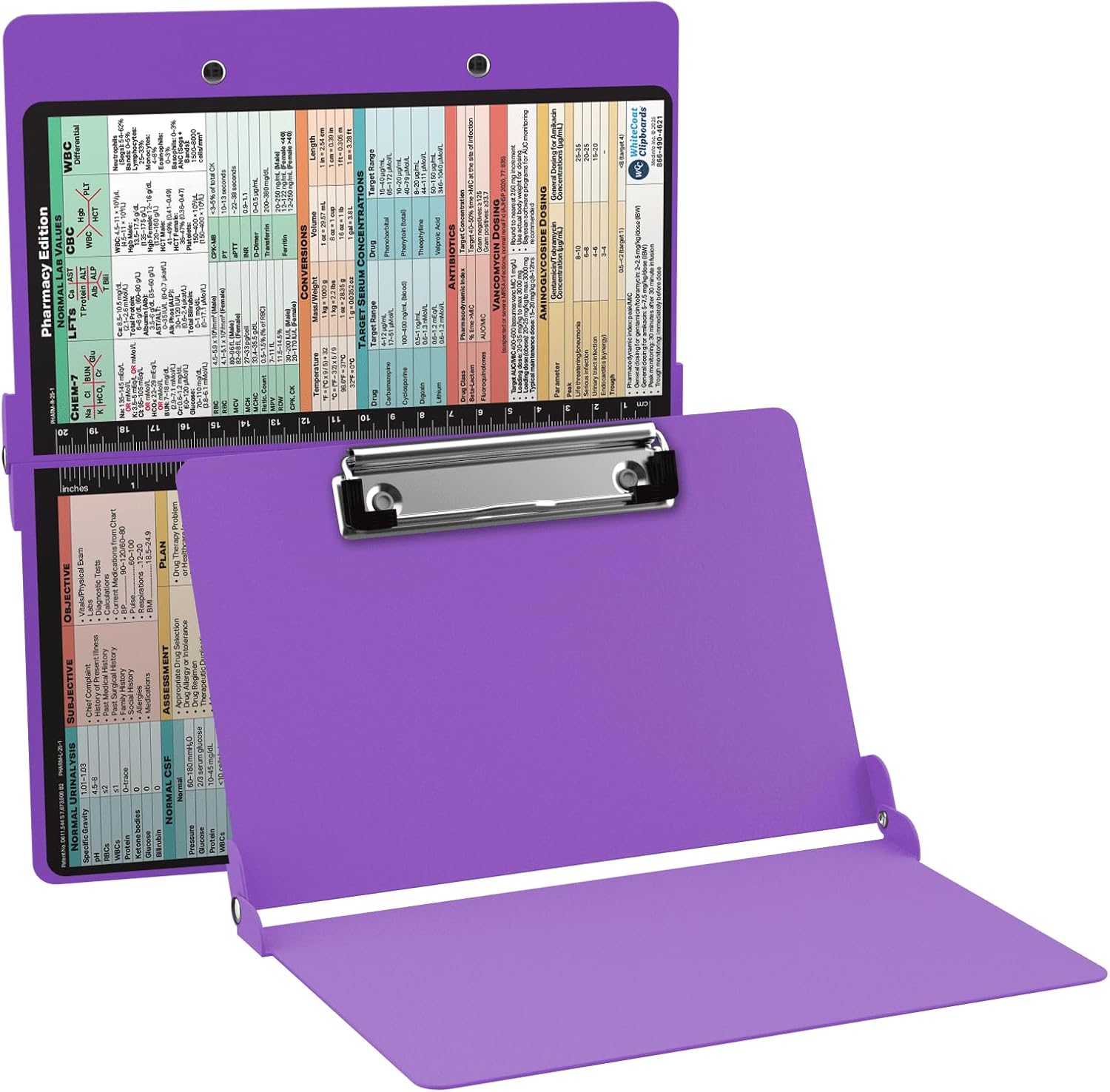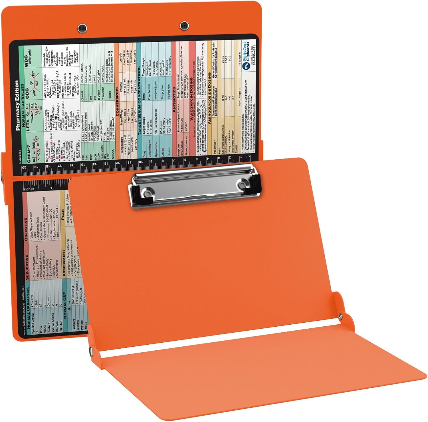 Full size pharmacy pocket clipboard from WhiteCoat Clipboard. Unique design allows the clipboard to fold in half for storage in your pocket. Made of lightweight aluminum with the ability to carry 15 pieces of paper without a crease, while at the same time securing all your medical information inside. Carry extra history and physical exam forms, SOAP notes or progress note pages without worry of losing your data. The clipboard also functions as a quick medical reference guide with detailed day-to-day information.
